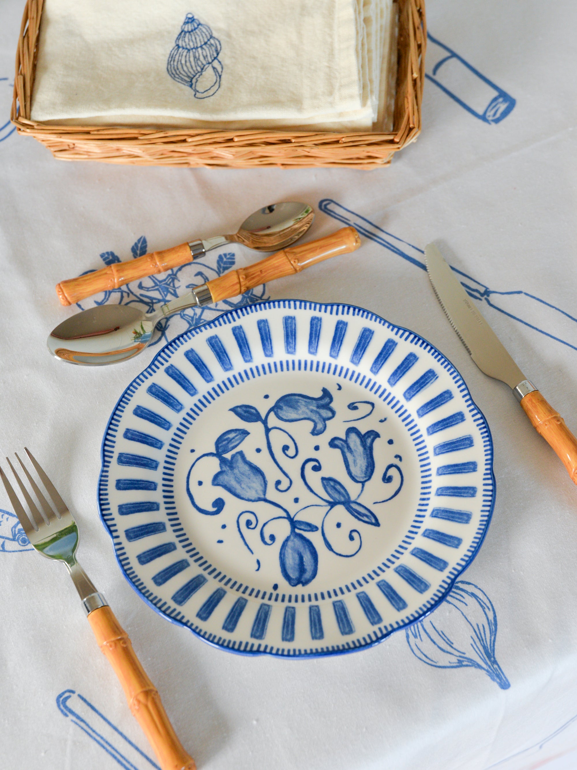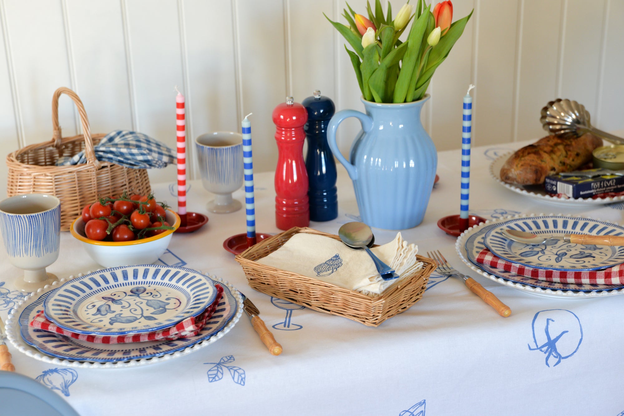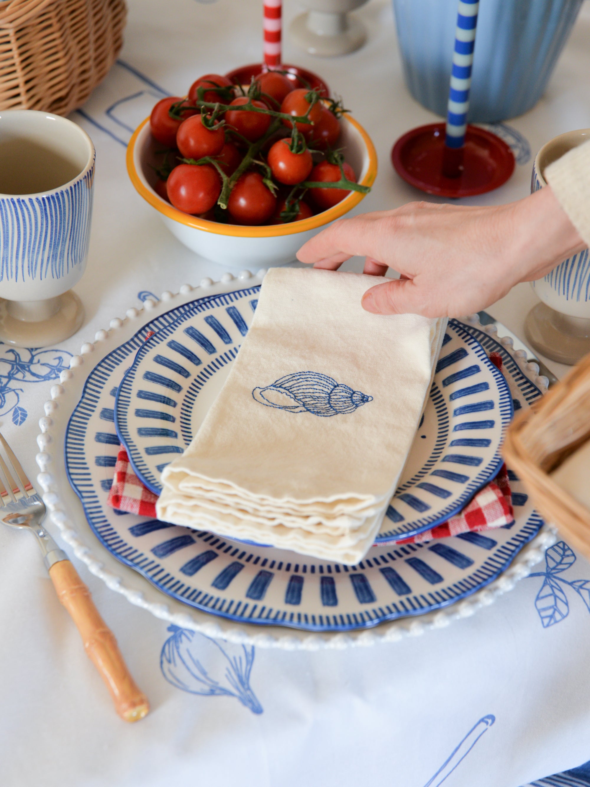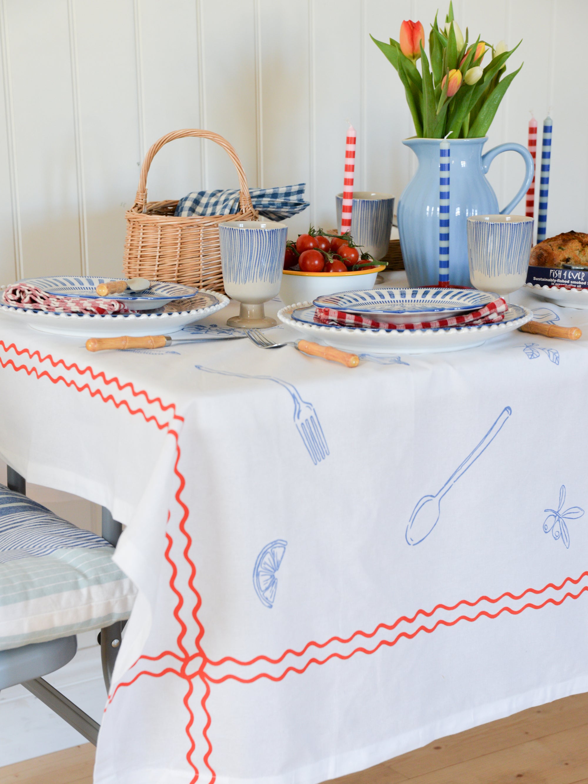 On the table, you’ll find a crisp white tablecloth featuring summertime motifs with a wiggly border. For decoration, we’ve added tulips in a classic stoneware jug. We’ve styled our conch-embroidered napkins alongside French porcelain plates and bamboo cutlery for an elevated nautical look.